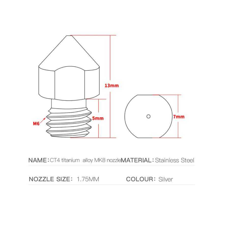 0.5mm filament çıkış çapına sahip titanyum alaşımlı mk8 nozuldur. Standart pirinç ve çelik nozzle'lara oranla aşınma ihtimali çok düşüktür ve çok yüksek sıcaklıklara dayanmaktadır. Genellikle Karbon Fiber vb. katkılı filamentlerle baskı alınırken tercih edilmektedir.