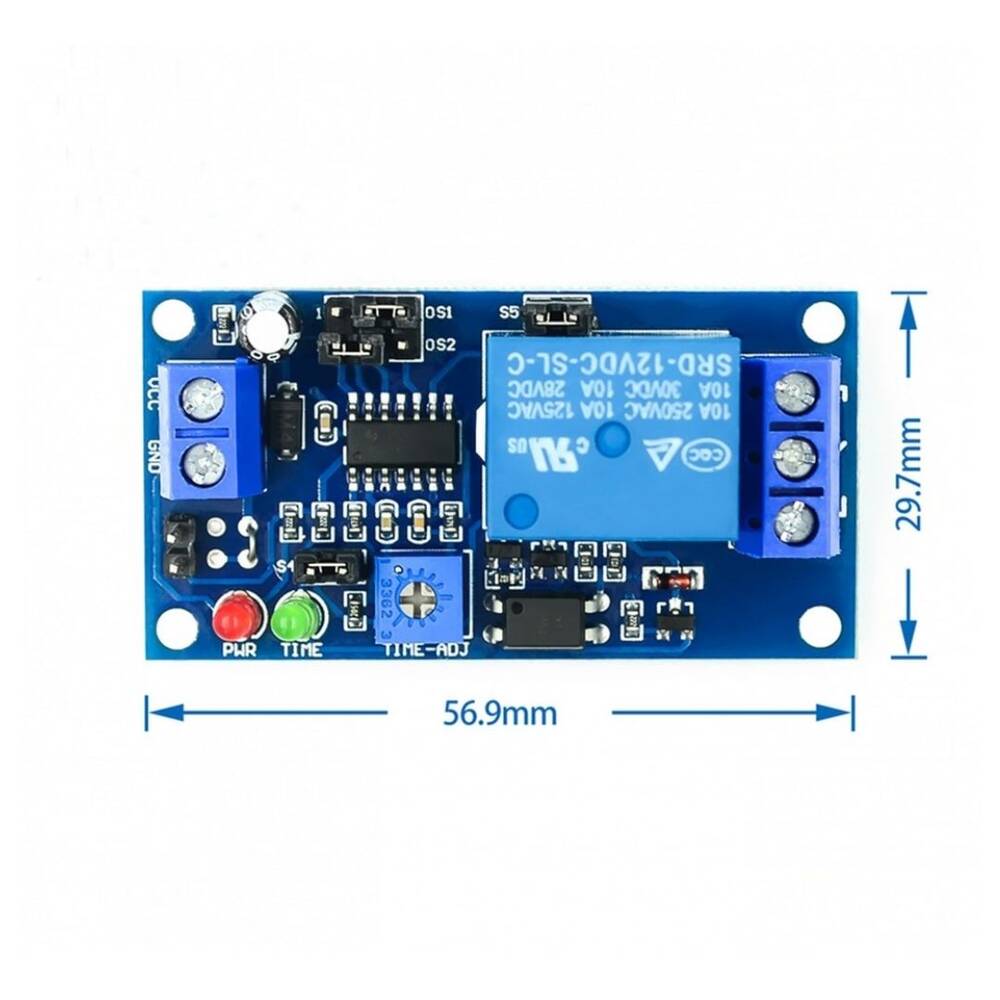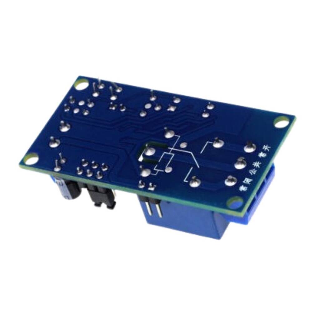 12v dc besleme gerilimine sahip zaman ayarlı röle devresi. Ekranlı olan modellerden farklı olarak zaman ayarlaması bu devre üzerinde bulunan pinler ve trimpot ile deneme yanılma ile yapılmaktadır.