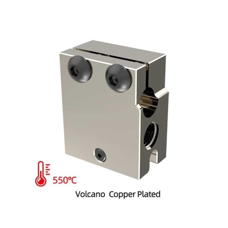 Volcano tipindeki bu ısıtıcı blok bakır kaplaması sayesinde 550°C ye kadar sıcaklığa çıkmaktadır. 3D yazıcılarda filamentin ısıtıldığı bölümdür. Isıtıcı fişek ve sıcaklık sensörü bu bloğun üzerine montajlanmaktadır. E3D Volcano modeli hotendlerle uyumludur.