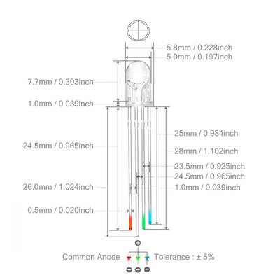 5mm RGB, ortak anot mantar leddir. RGB ledler, Kırmızı, yeşil ve mavi ledlerin birleşiminden oluşmaktadır. Bu sayede tek led ile bu 3 ana rengi ve karışımlarından oluşan ara renkleri yakabilirsiniz.