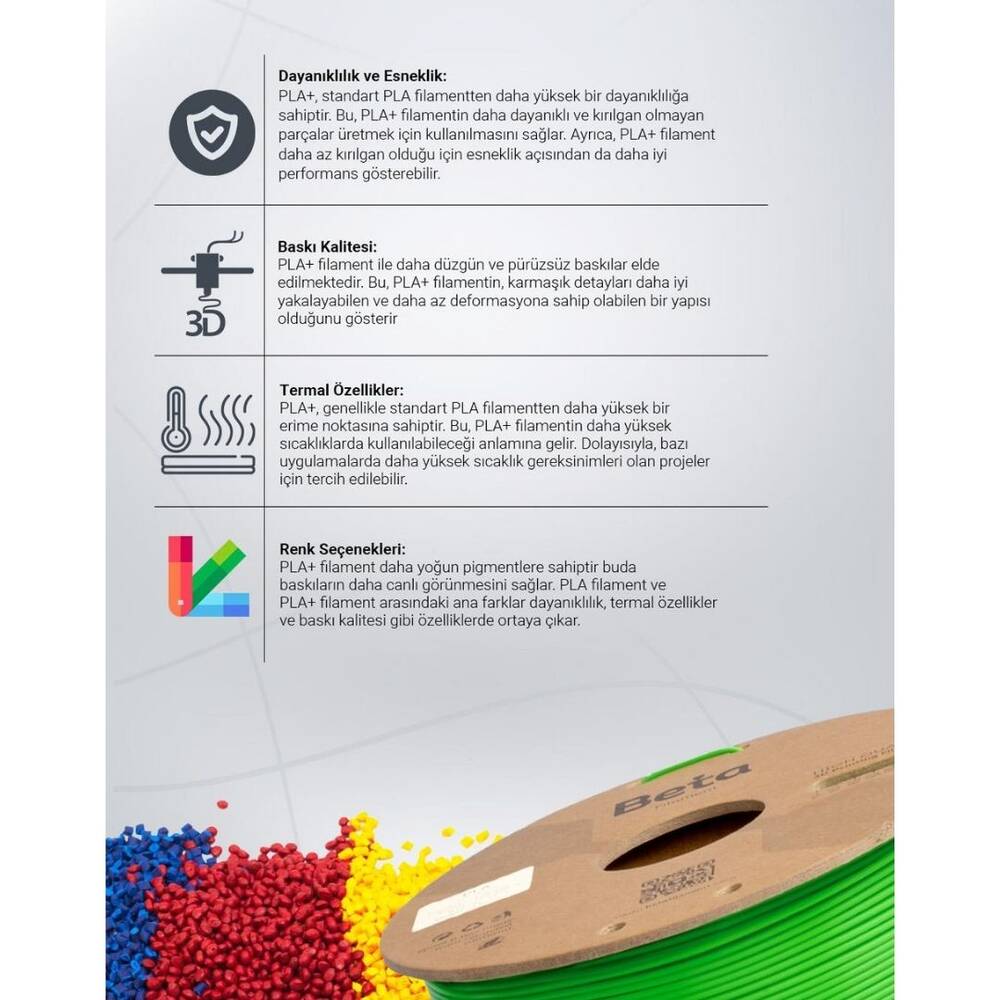 Çeşitlilik ve Canlı Renk Seçenekleri: Beta PLA+ filament, yüksek kaliteli PLA granüllerinden üretilmiştir ve canlı renk seçenekleri sunar. Bu filament, kaliteli malzemesi sayesinde baskılarınızın net ve keskin renklere sahip olmasını sağlar. Ayrıca, geniş renk yelpazesiyle kullanıcılarına zengin bir seçenek sunar. Canlı renkler, baskılarınızı daha çekici hale getirir ve yaratıcılığınızı ifade etmenize olanak tanır. Bu özellikler, Beta PLA+ filamenti 3D baskı projelerinizde tercih etmeniz için güçlü bir neden oluşturur.