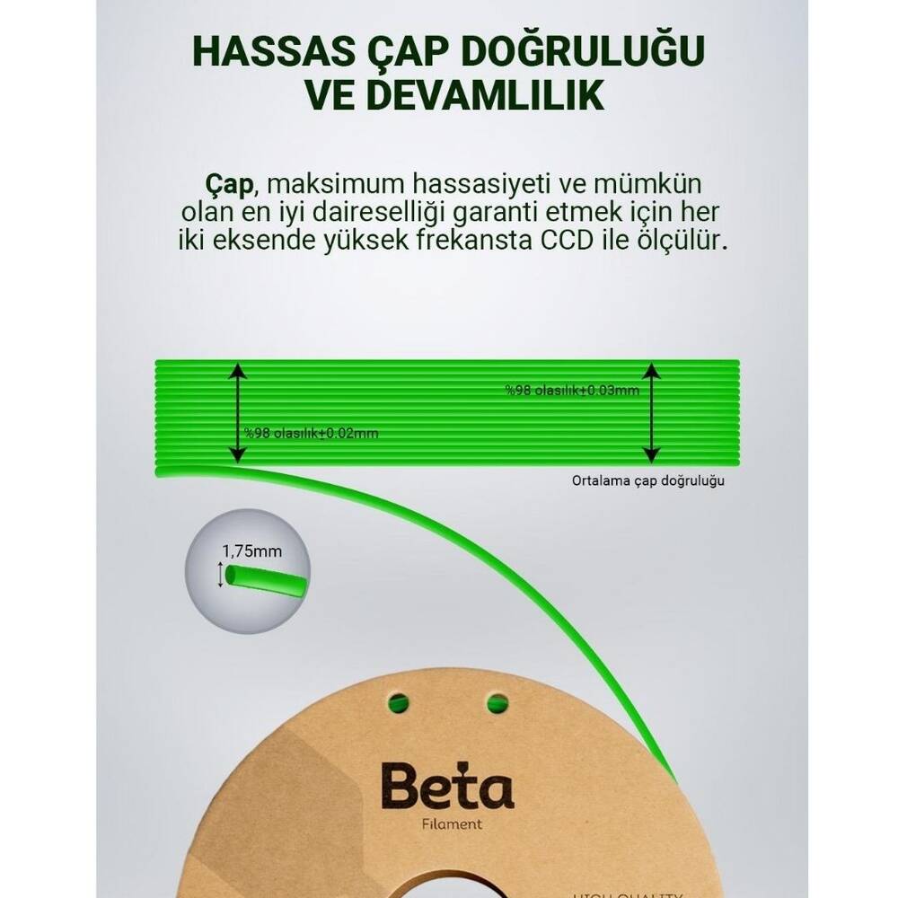 Yüksek Kalite ve Hassasiyet: Beta PLA+ filament, yüksek kaliteli malzemelerin kullanımıyla üretilmiştir. Bu, baskılarınızın ayrıntılarının net ve keskin olmasını sağlar. Filamentin homojen yapısı, baskılarınızın pürüzsüz ve düzgün bir şekilde oluşturulmasını sağlar. Bu özellik, hassas parçalar veya detaylı prototipler oluştururken önemlidir.