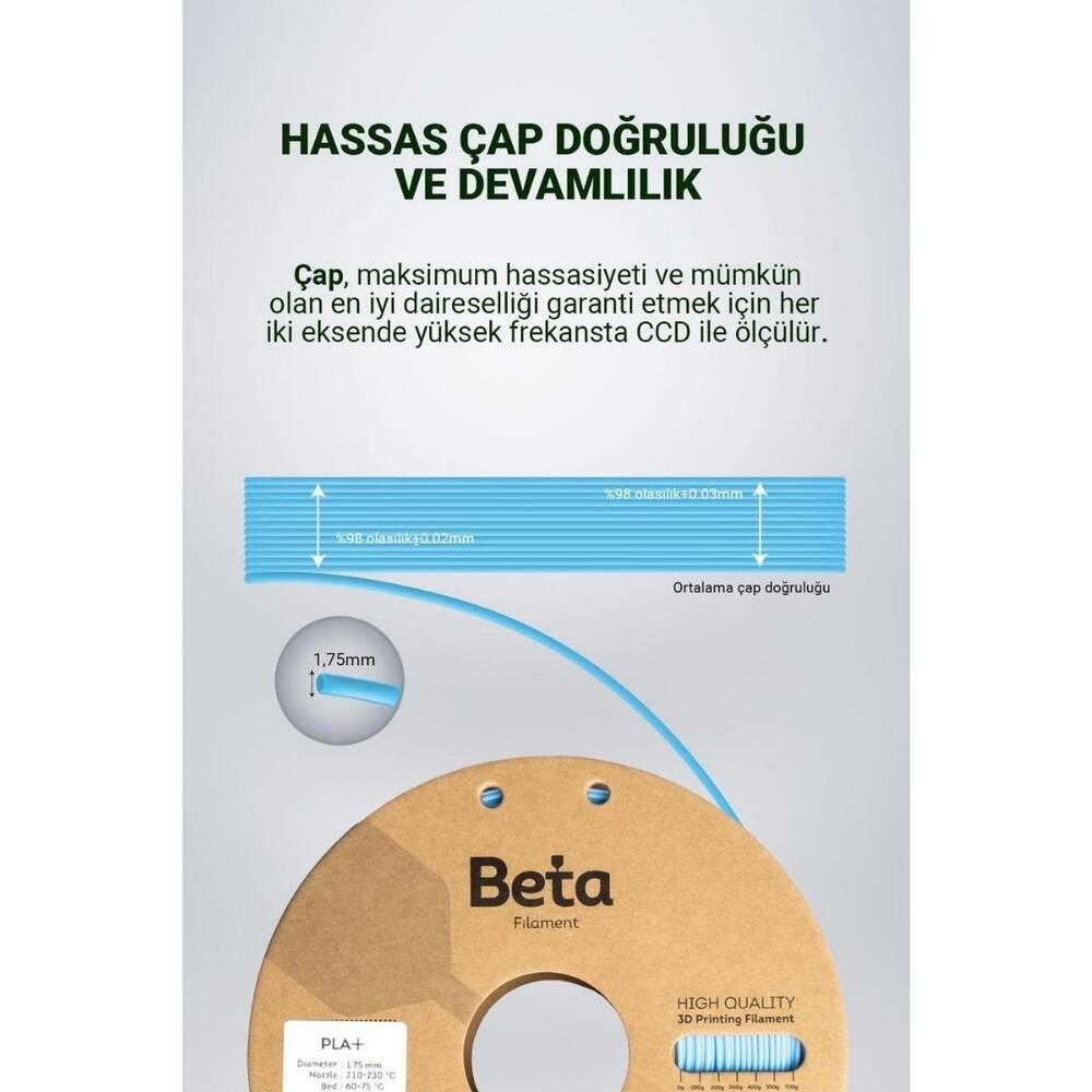 Yüksek Kalite ve Hassasiyet: Beta PLA+ filament, yüksek kaliteli malzemelerin kullanımıyla üretilmiştir. Bu, baskılarınızın ayrıntılarının net ve keskin olmasını sağlar. Filamentin homojen yapısı, baskılarınızın pürüzsüz ve düzgün bir şekilde oluşturulmasını sağlar. Bu özellik, hassas parçalar veya detaylı prototipler oluştururken önemlidir.